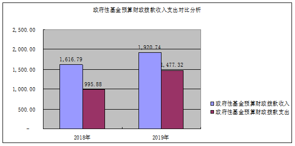 2019年度政府性基金预算财政拨款收入1,920.74万元,均为项目收入,与上年1,616.79万元相比,增加303.95万元,同比增长18.80%。政府性基金预算财政拨款支出1477.32万元,均为项目支出,与上年995.88万元相比,增加481.44万元,同比增长48.34%。主要原因是预算单位政府性基金项目(地区旅游发展委员会暗夜公园工程项目;地区污水处理理中心污水处理设施建设和运营项目;地区民宗局等16家预算单位全民健身登山步道、民族体育挖掘、整理、弘扬、中小学笼式足球场、体育彩票公益金)增加,导致财政府性基金预算政拨款收入支出增加。