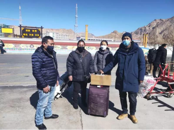 普兰县人民检察院党组书记、检察长次仁拉姆同志(左2)接送普兰县干部职工返岗