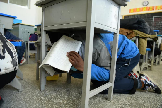 演练过程中,随着第一声哨声的响起,班主任迅速发出“现在地震来袭,实施紧急避险”的指令,要求学生在教室内优先选择课桌下方进行避险,避险空间不足则用书包或书本保护头部,在课桌(椅)旁下蹲避险。随着第二声哨声再次响起,各班班主任带领学生根据演练方案中规定的路线,用课本或者手护住头部,沿着指定楼梯口快速疏散,有序撤离到安全地点。集合之后,各班主任马上清点人数,并向现场总指挥汇报,整个过程紧张有序、实用性强,达到了预期的效果。