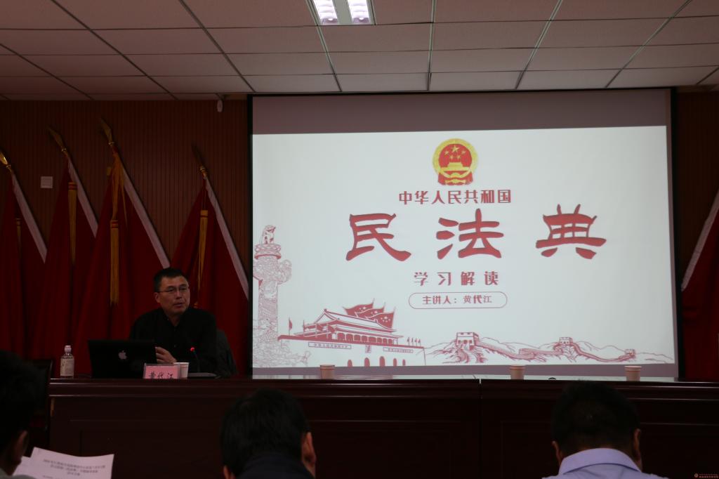 第一项议程,由地委党校副校长黄代江给行署办公室全体干部作学习贯彻《民法典》专题辅导讲座。黄校长围绕“编纂民法典的重要意义、编纂《民法典》的总体要求和基本原则、编纂《民法典》工作开展情况、《民法典》的主要内容”等四个重要版块进行了全面解读。