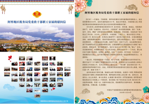 近期,国家税务总局阿里地区税务局党委向全体干部职工家属派发了169份慰问信,区内外的干部家属陆续收到从千里之遥的阿里寄出的EMS,里面装着单位的慰问信以及干部的工作生活照。在节前对干部职工家属表示问候和祝福,简单介绍了干部生活工作保障情况和下一阶段工作的“暖心”安排,最大限度做到让家属放心、干部暖心。
