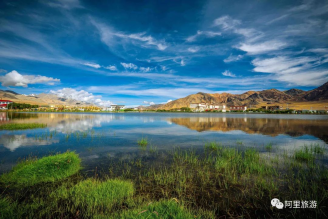 沿着河流,在一座小山上,有一座扎西岗寺,扎西岗寺旁边有一座村落。村口的水潭水底清澈可见。当雪山、云朵、寺庙与村庄倒映在水潭中,天上与地下融为一体,更让人觉得惊艳。