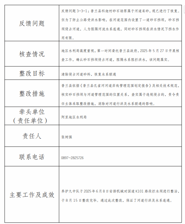 第二轮西藏自治区生态环境保护专项督察报告 反馈意见(3-3-1)整改措施 完成情况公示表