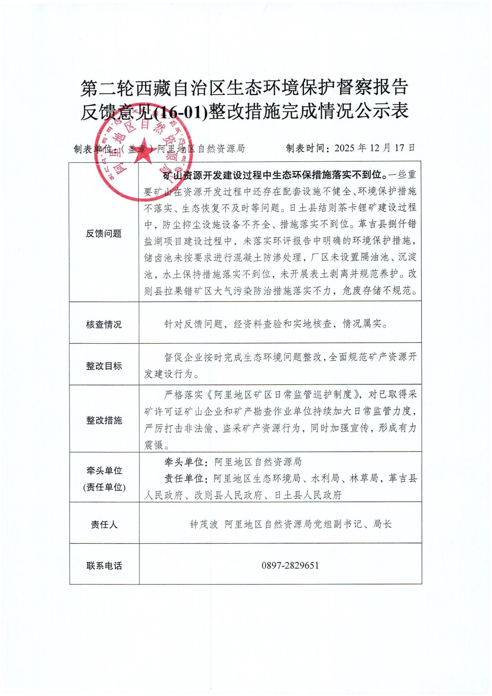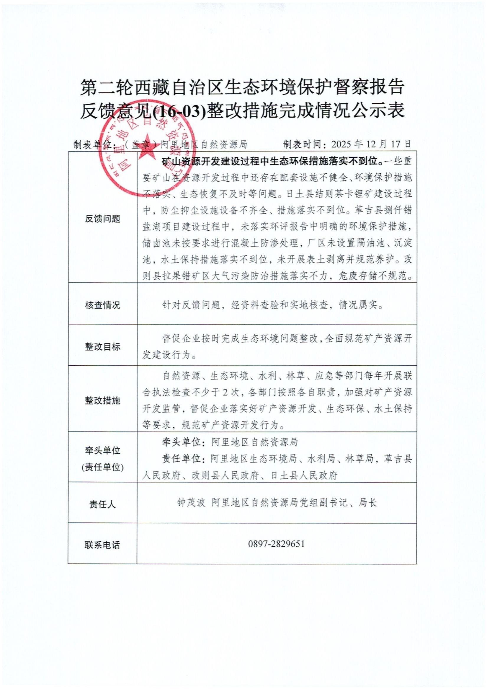 第二轮西藏自治区环境保护督促报告反馈意见(16-01、02、03)整改公示表