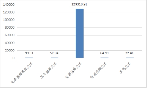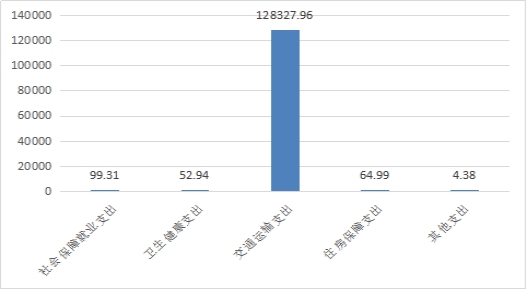 2019年支出明细为:社会保障就业支出99.31万元;卫生健康支出52.94万元;交通运输支出128327.96万元;住房保障支出64.99万元;其他支出4.38万元。