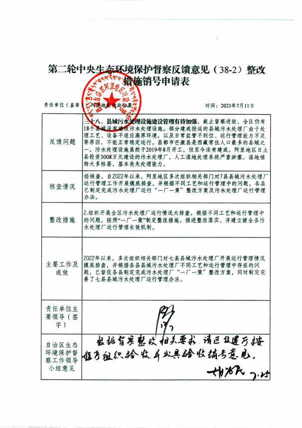 第二轮中央生态环境保护督察反馈意见(38-2)整改措施销号申请表