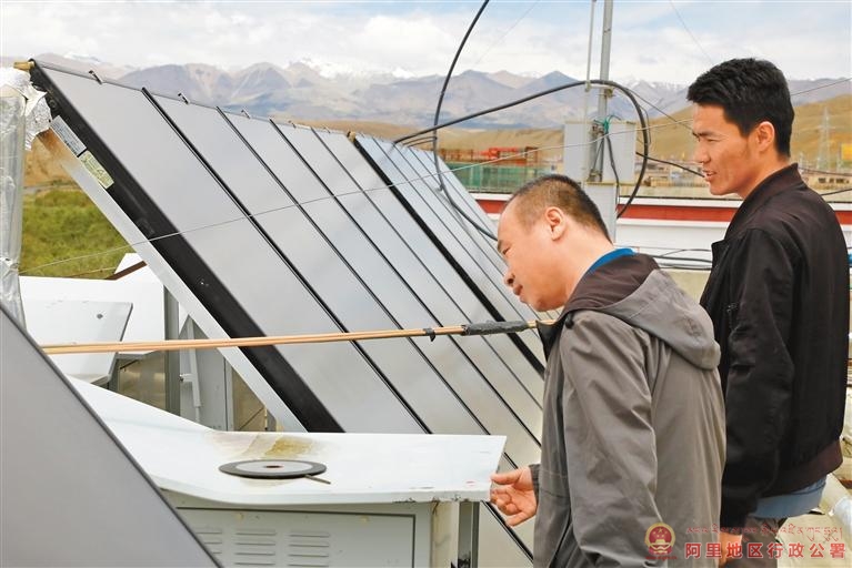 图为香孜乡干部在检查太阳能供热设备。西藏日报记者 永青 扎西罗布 摄