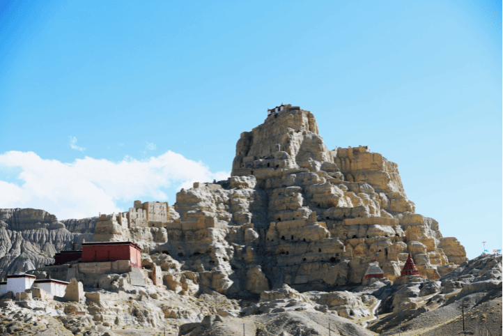 古格王国遗址在阿里地区札达县托林镇札布让村两公里外的一座土山上,海拔高度为3680米,占地面积72万平方米。遗址现存遗迹群有房(殿)址445间、窑洞(石窟)880孔、碉堡58座、佛塔28座等。