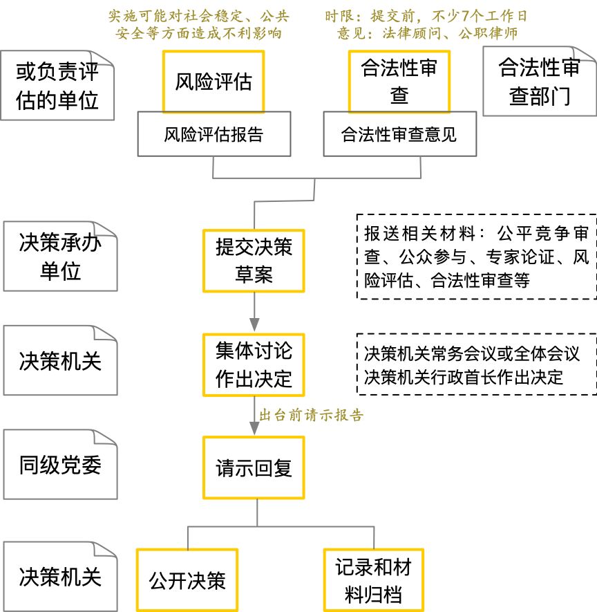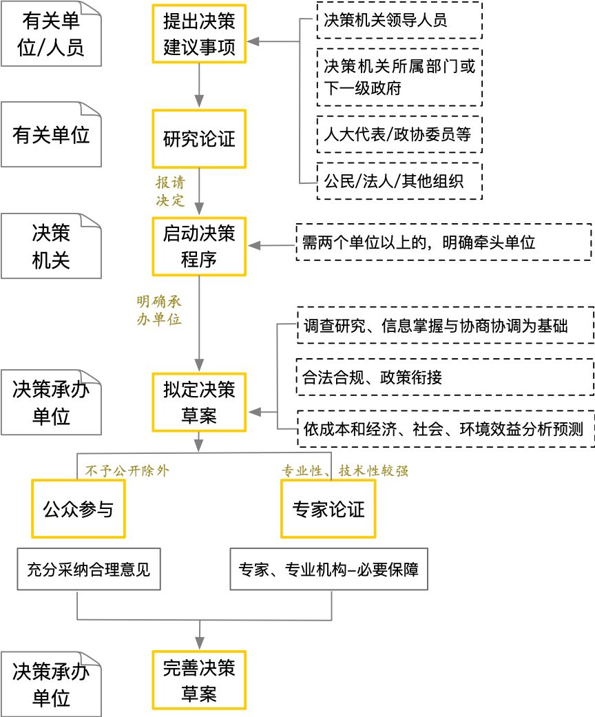 1.决策启动。提出决策事项建议的,应当论证拟解决的主要问题、建议理由和依据、解决问题的初步方案及其必要性、可行性等。决策承办单位应当全面梳理与决策事项有关的法律、法规、规章和政策,使决策草案合法合规、与有关政策相衔接。