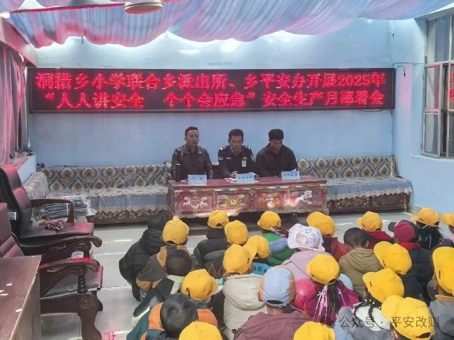 改则县公安局洞措乡派出所联合乡小学召开“人人讲安全、个个会应急”安全生产月宣传活动