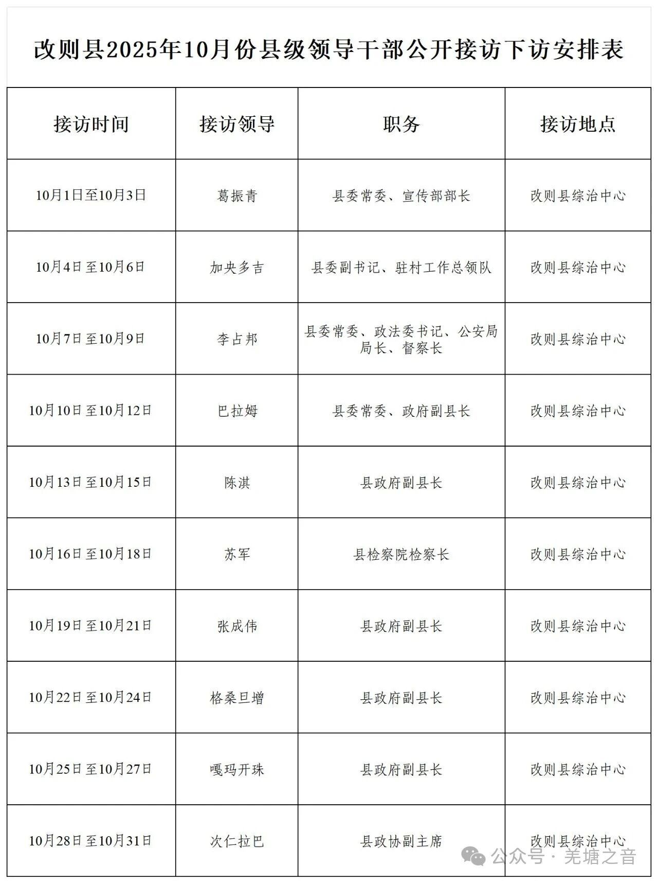 根据工作方案,结合我县实际,现向全社会公布改则县2025年10月份县级领导干部接访下访安排表,请广大群众相互告知,依法有序进行信访活动。