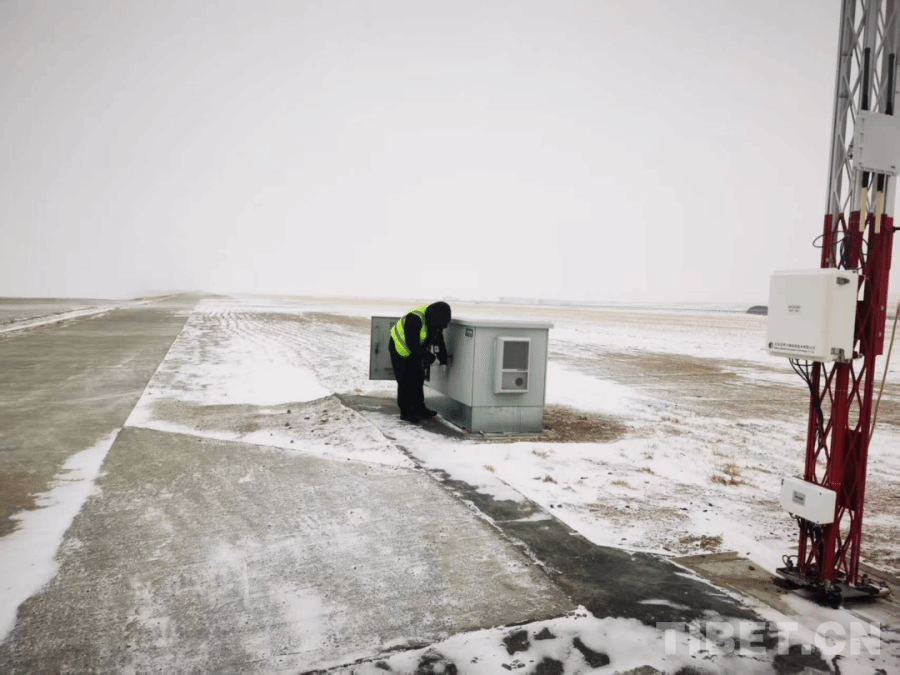 普兰机场工作人员在风雪中维护跑道设备。