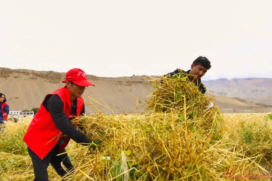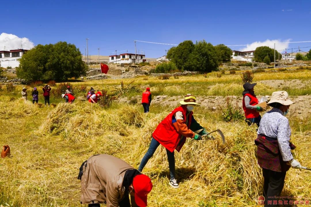 为抢抓晴好天气收割,力争颗粒归仓。普兰县积极组织百名党员深入田间地头,帮助缺劳力户开展秋收工作。村民和前来帮忙的党员一同劳作,满怀喜悦地在秋色里俯身收割青稞、豌豆、油菜,搬运、打谷、装袋,大家分工合作,忙得热火朝天。