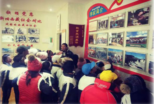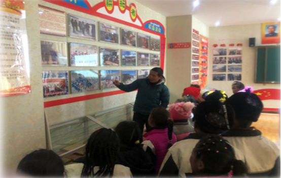 思政老师带领学生参观了学校德育室,并通过新旧西藏对比、民族团结典型人物事迹进行解说。