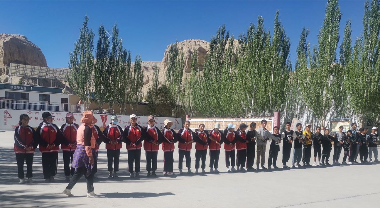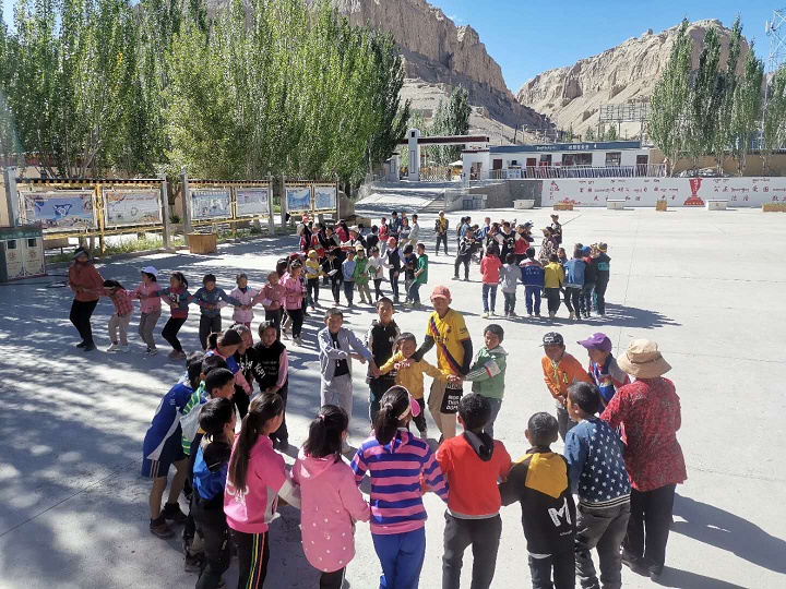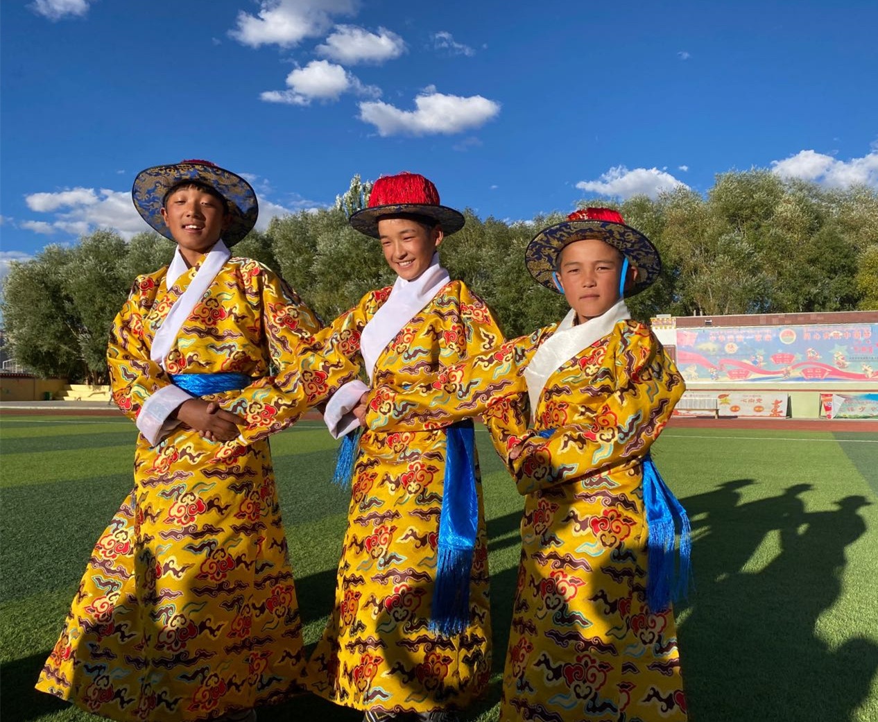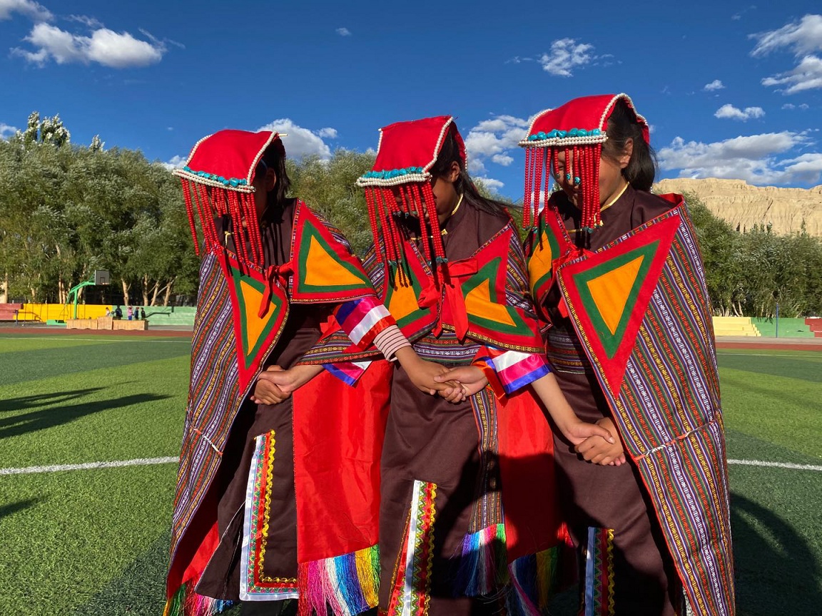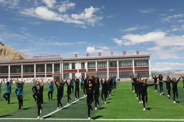 早在2016年,札达县九年一贯制学校便开始了非遗文化传承工作,编排了一套宣舞广播体操。几年来,每当下午清脆的下课铃声响起,几百名学生涌入操场,整齐列队。在民族音乐的伴奏下,孩子们时而做出如雄鹰翱翔的体操姿势,时而做出如快马飞驰的体操姿势,举手投足间尽显民族风情,这就是极具古格特色的学生广播体操——“宣舞体操”。