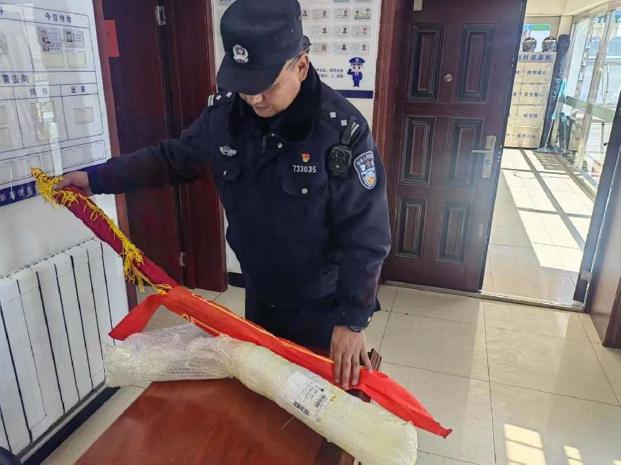 2024年4月2日上午,噶尔县公安局康乐新居便民警务站收到辖区群众张某从成都寄来的一面印有“秉公执法不徇私情、人民心中的好警官”的锦旗,对民警高效解决困难表示感谢。