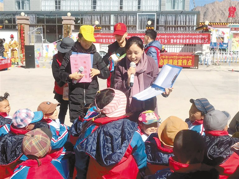 噶尔县将“四讲四爱”宣传教育融入“五下乡”活动中,收到了良好效果,赢得了群众普遍欢迎。图为宣讲员在狮泉河镇加木村向孩子开展“四讲四爱”知识点有奖问答。