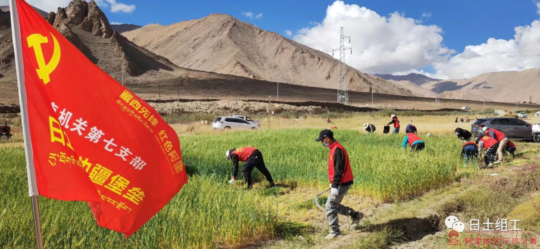 20余名在职党员身穿党员志愿服务红马甲,在党旗的指引下,走入田间地头,同农牧民群众一道收割青稞。大家头顶烈日、手拿镰刀,一边麻利地挥动着镰刀,一边整齐地码放着青稞,一边热火朝天忙收割,一边与群众拉家常,同时还不忘相互叮嘱要安全使用镰刀,做到既不放过一株一穗,又要确保自身安全,确保成熟一片、收割一片,做到颗粒归仓。