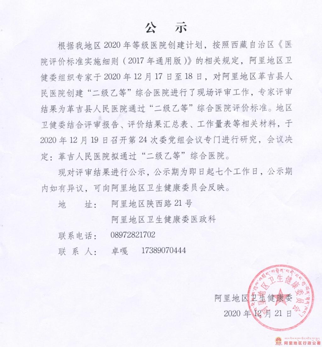 关于革吉县人民医院拟通过“二级乙等”综合医院的公示