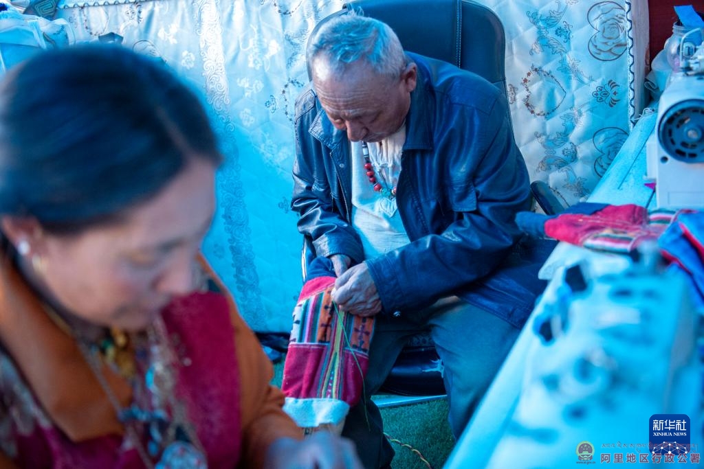 8月27日,努拉老人和妻子玉措正在缝制森郭服饰。(旦增努布摄)