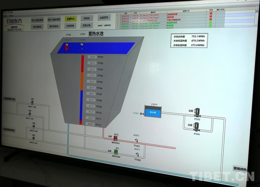 图为运行控制系统上可实时检测蓄热水池中各部分的水温,平均温度可达到60℃左右 摄影:王佳豪