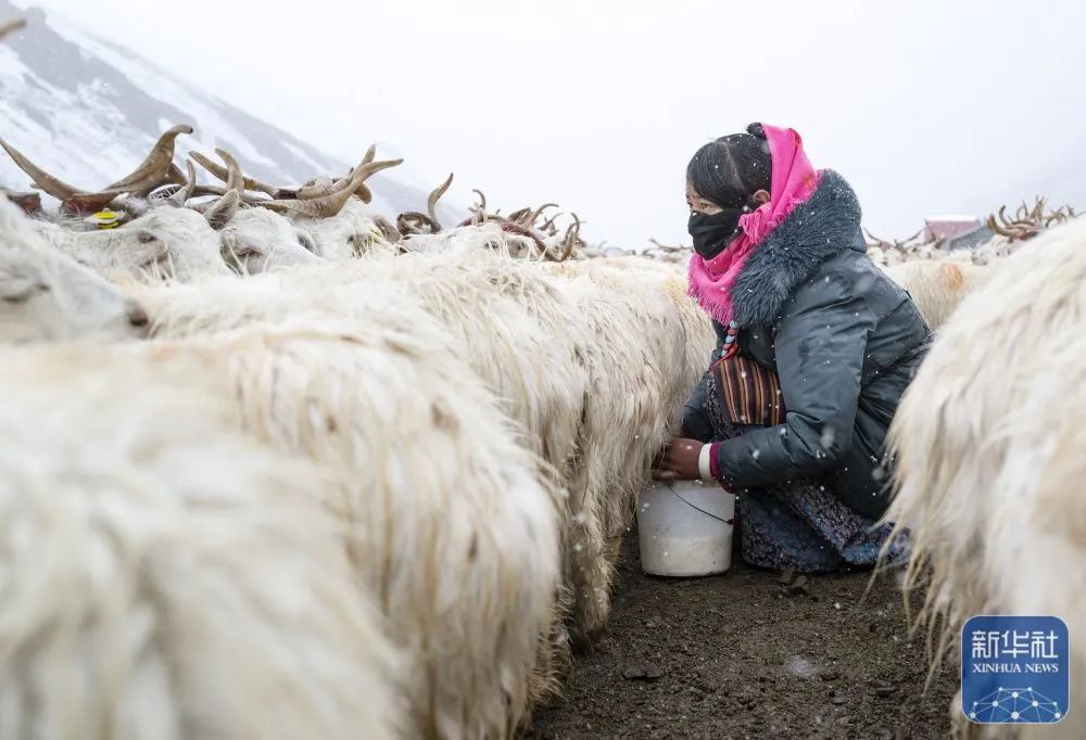 ↑9月13日,在日土县龙门卡村白绒山羊扩繁场,饲养员准备给白绒山羊挤奶。