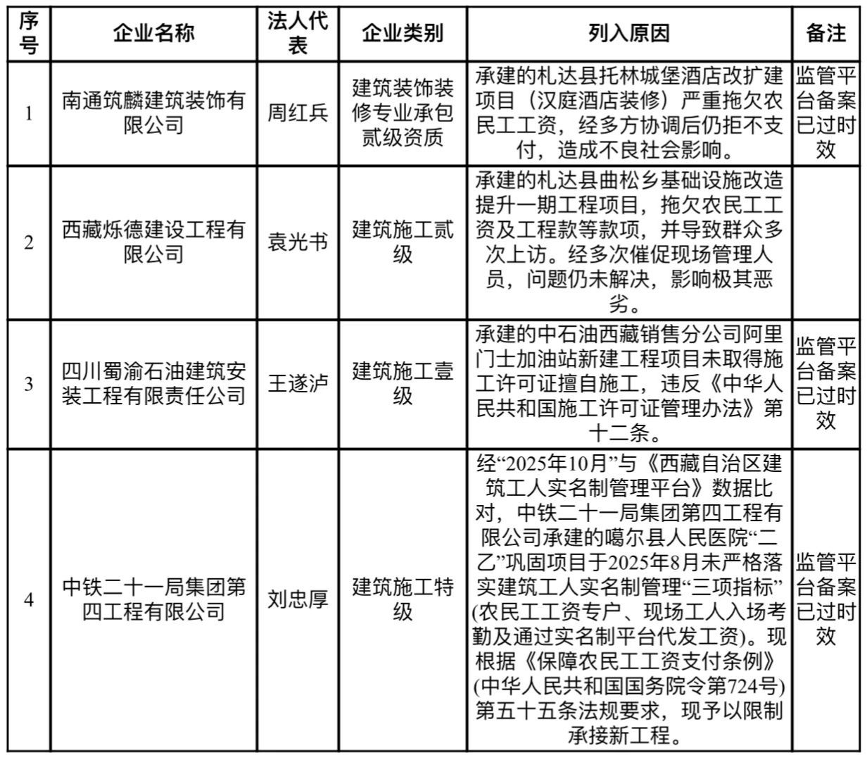 为持续深化阿里地区房屋建筑和市政设施建设领域信用体系建设,严厉打击违法违规行为,规范建筑市场秩序,依据《国务院关于建立完善守信联合激励和失信联合惩戒制度加快推进社会诚信建设的指导意见》《西藏自治区建筑市场管理条例》《保障农民工工资支付条例》等相关规定,结合各级住建部门日常监管、项目核查及企业违法违规行为处理情况,现将2025年度第三批建筑企业“黑名单”“不良行为记录”名单及截至本公告发布时的现有红黑名单、不良行为记录企业汇总名单予以公布。