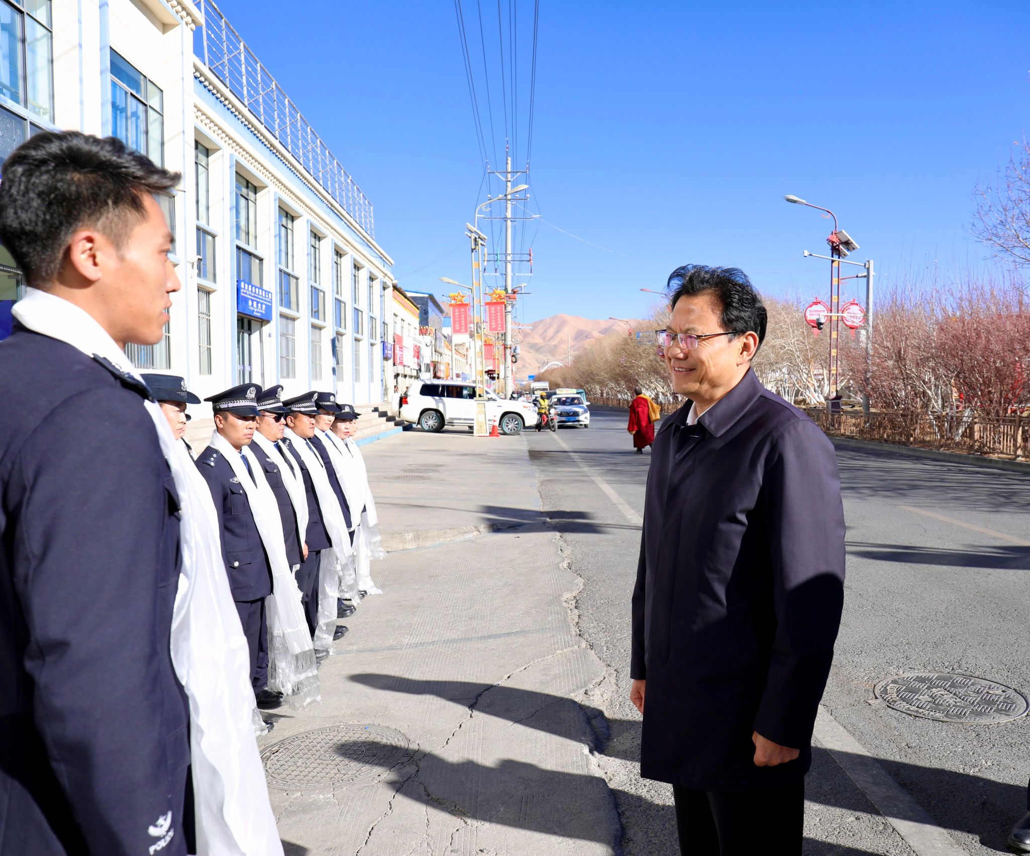 索南丹增先后来到噶尔县公安局滨河派出所、地区公安处情指中心,与一线民警一一握手,亲切交流,关心询问大家的工作生活情况。他说,公安队伍是维护社会稳定、服务人民群众的“主力军”,是平安阿里、法治阿里的“守护者”。过去一年,全地区各级公安机关和广大公安民警始终牢记“对党忠诚、服务人民、执法公正、纪律严明”的总要求,全力以赴防风险、保安全、护稳定、促发展,为推进阿里长治久安和高质量发展作出了积极贡献。希望广大公安民警深入学习贯彻习近平总书记关于新时代公安工作的重要论述,坚定捍卫“两个确立”、坚决做到“两个维护”,聚焦“四件大事”聚力“四个创建”,筑牢忠诚警魂,强化政治担当,厚植为民情怀,加强队伍建设,着力在捍卫政治安全、维护社会安定、保障人民安宁、促进司法公正的新征程上,再立新功、再创佳绩,为建设雪域高原的“西部明珠”作出新的更大贡献!