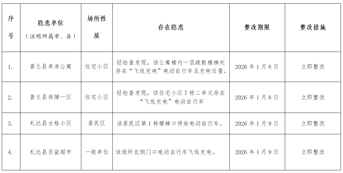 阿里地区消防救援支队1月火灾隐患曝光表