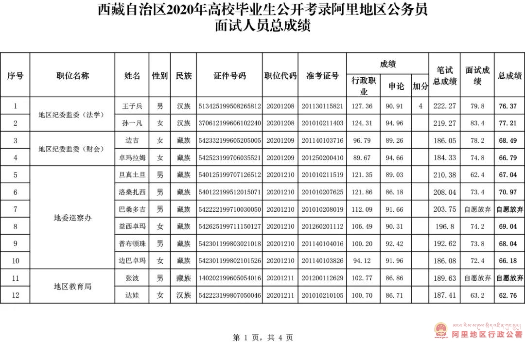 - 名 称:2020年我区高校毕业生公开考录阿里地区公务员面试成绩和总成绩