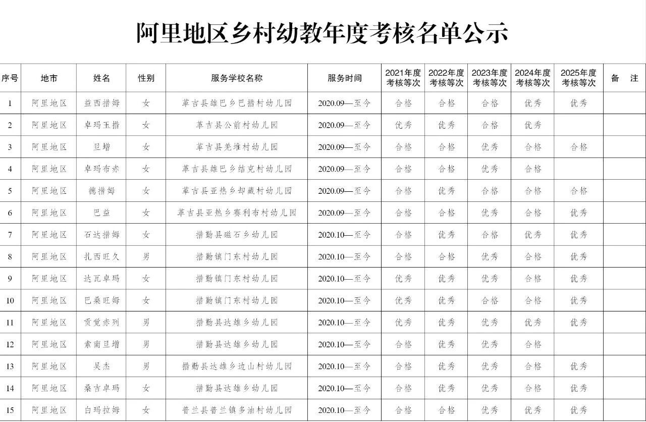 阿里地区教育局关于卓玛玉措等15名乡村幼教服务期满享受加分政策人员名单公示