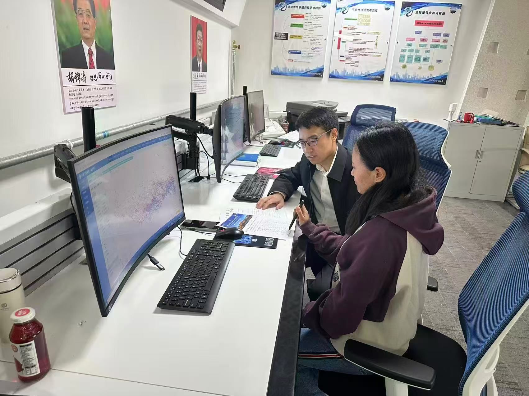 10月2日,阿里地区气象局援藏干部孟伟强正在与预报员正在分析天气情况。米玛次仁摄影