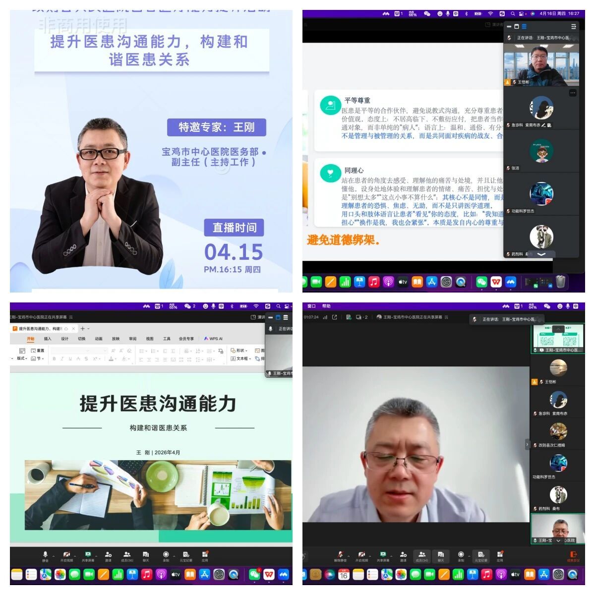 王刚副主任结合自身十余年临床与医务管理经验,从当前医疗环境痛点切入,用“67%的医疗纠纷源于沟通缺陷”“超过八成投诉与沟通不到位有关”的行业数据点明了提升沟通能力的紧迫性,围绕“理论原则-实战技巧-场景应用-风险防范”四大维度展开系统讲解,深度解析了以患者为中心、主动倾听、平等尊重、同理心、保密守信五大核心沟通原则,结合“73855沟通法则”阐释了非语言信号在医患互动中的重要价值;针对病史采集、重症告知、冲突处理、临终关怀四大临床高频场景,逐一拆解标准化应对流程,重点讲解了国际通用的重症告知SPIKES模型、矛盾化解“六不”原则等可直接落地的实操工具;结合《民法典》《医疗纠纷预防和处理条例》相关条款,明确了知情同意规范、沟通记录留存等法律风险防范要点,并针对住院医师、主治医师、科主任不同层级岗位提出了分级能力提升目标。