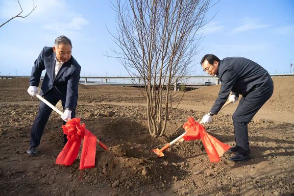 班公柳作为阿里昆莎机场特有树种,耐寒耐旱、生命力坚韧,是雪域高原生态绿化的优选品种,承载着高原民航人扎根边疆、无私奉献的精神品格。此次跨区域移栽,既是一次生态苗木的有序引种,更是新藏两地民航奋斗精神与深厚情谊的传承延续。活动现场,新疆机场集团党委书记、董事长陶润文及乌鲁木齐国际机场分公司党委书记、副总经理杨洪峰与西藏机场集团党委书记、董事长刘浩洋及阿里昆莎机场分公司总经理何勇携手培土、扶苗、浇水,共同完成23株班公柳栽植。其中3株大树平行布局,寓意新疆机场集团、西藏机场集团、乌鲁木齐天山国际机场三方协同支撑民航事业发展;20株幼树环绕成景,每株均悬挂纪念铭牌,成为两地民航情谊的实物见证。共同浇灌“同心水”,象征帮扶情谊与绿色希望在天山落地生根、蓬勃生长。